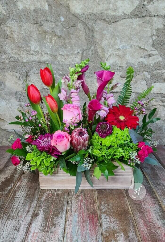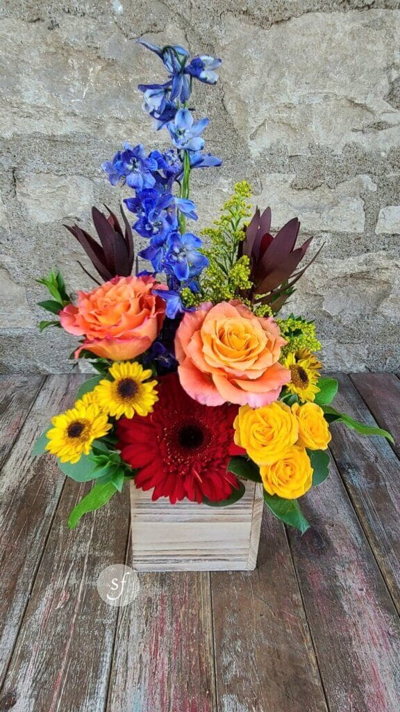 A rustic wooden box holds Roses, Gerbera Daisies, Delphinium, Golden Aster and Safari Sunset in all the vibrant colors of of a brilliant Kansas sunset.