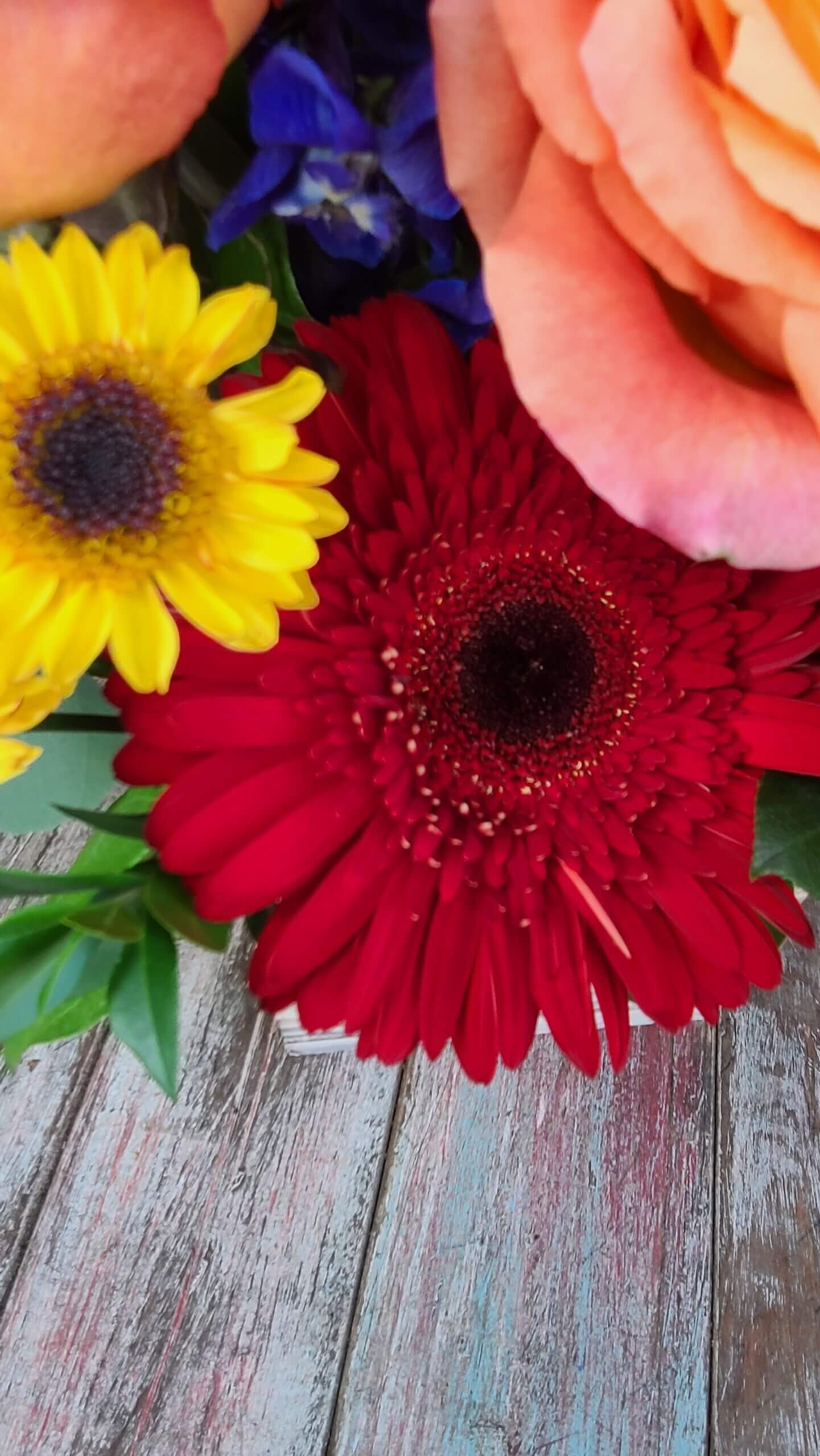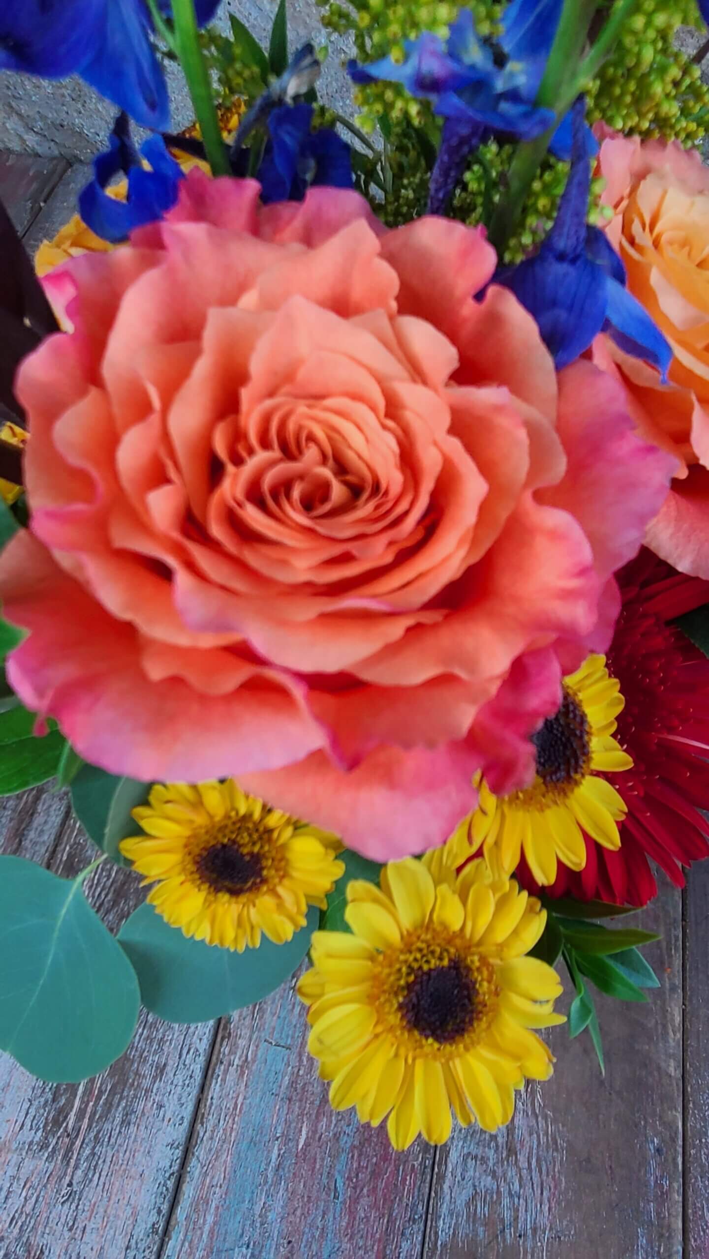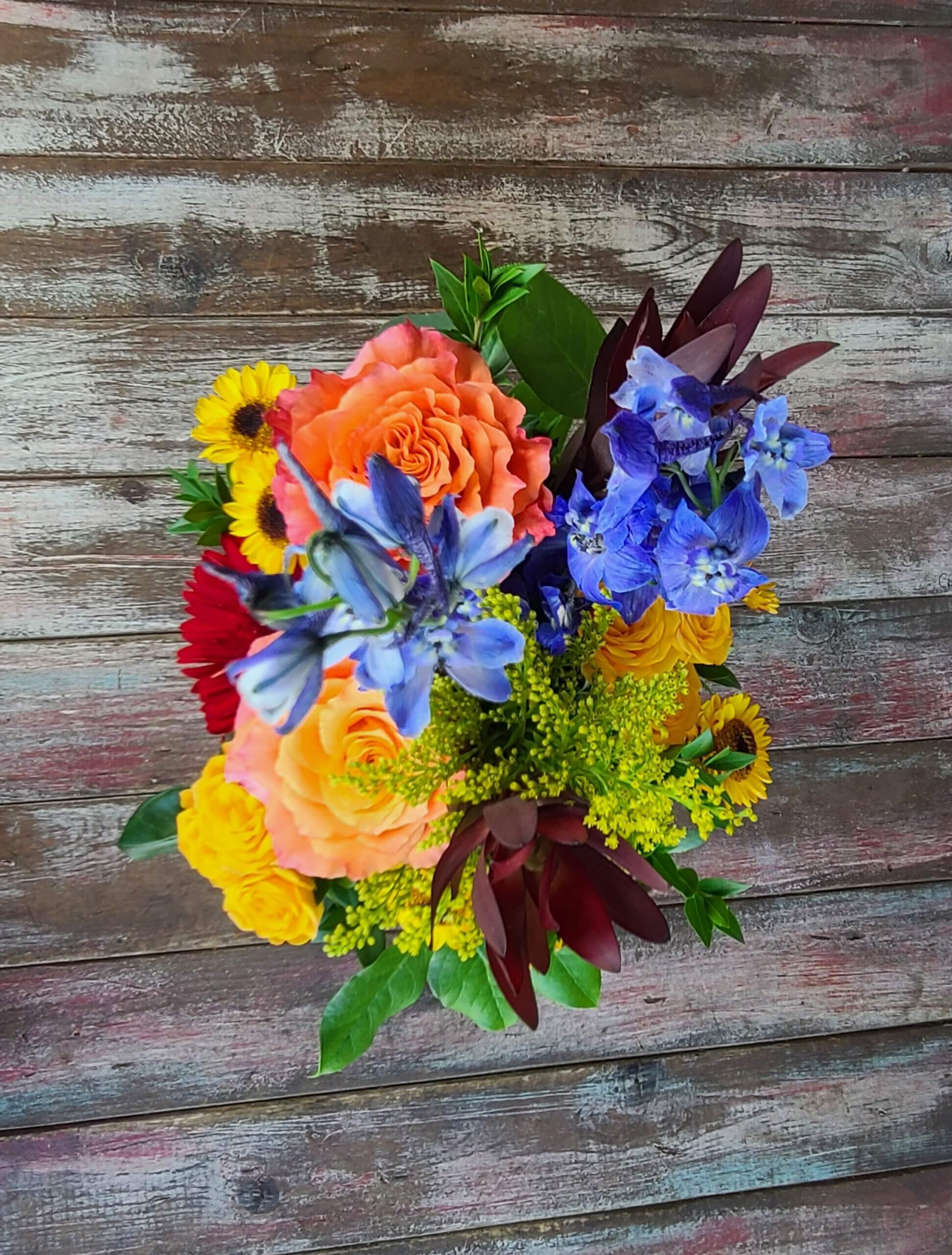 A rustic wooden box holds Roses, Gerbera Daisies, Delphinium, Golden Aster and Safari Sunset in all the vibrant colors of of a brilliant Kansas sunset.