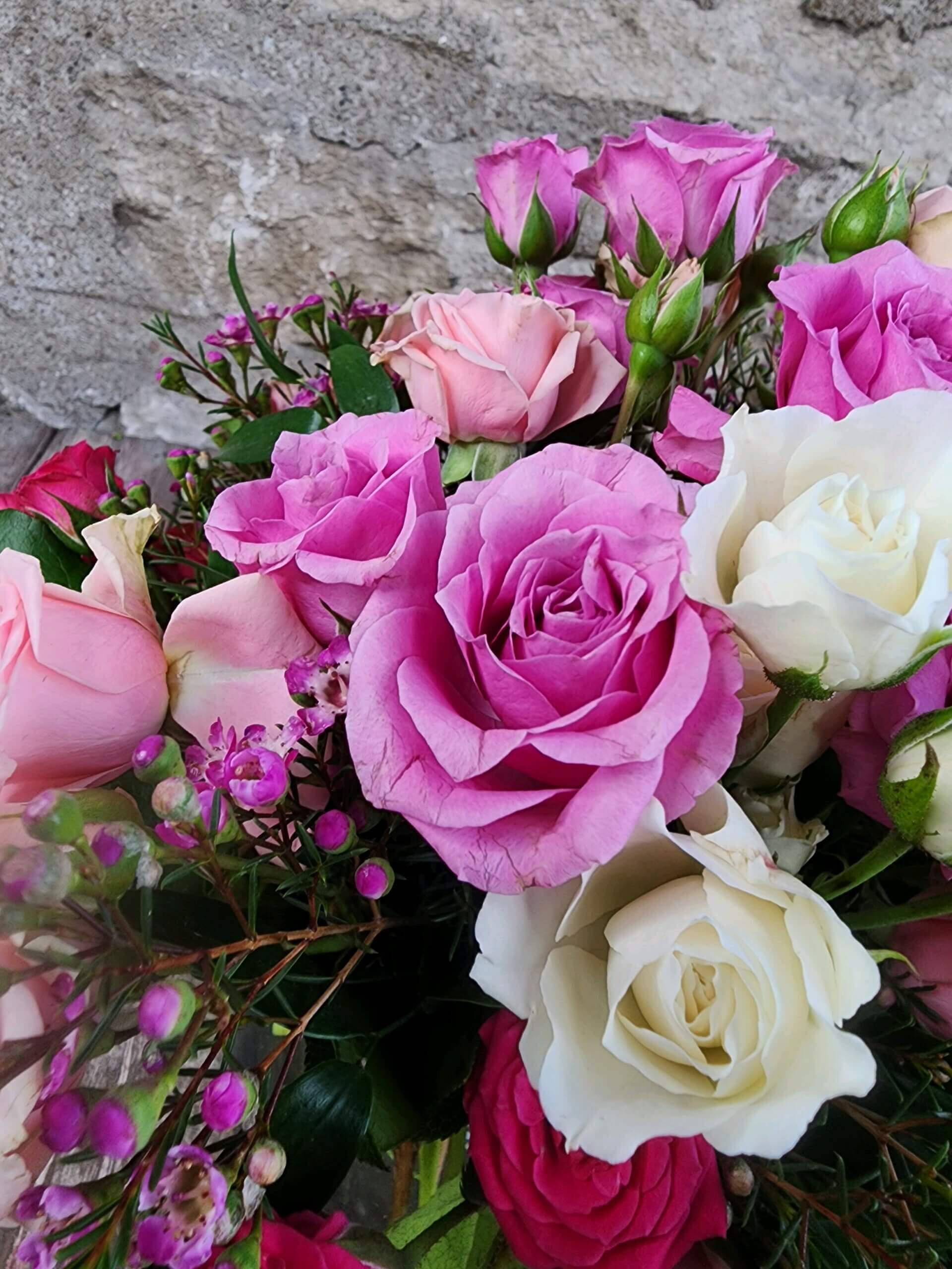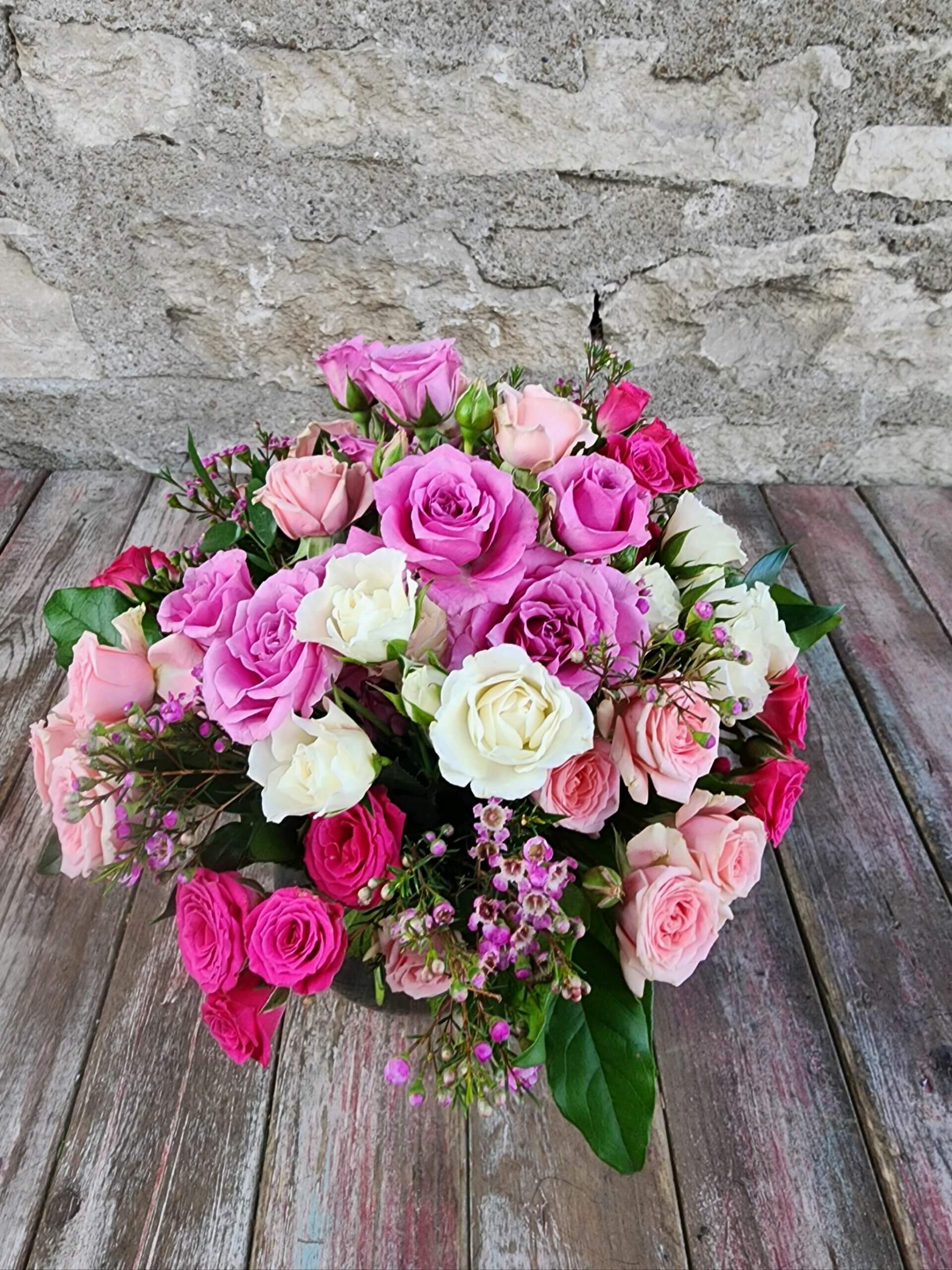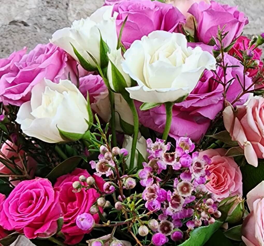 An array of Spray Roses are beautifully blended in our rosie posie vase.